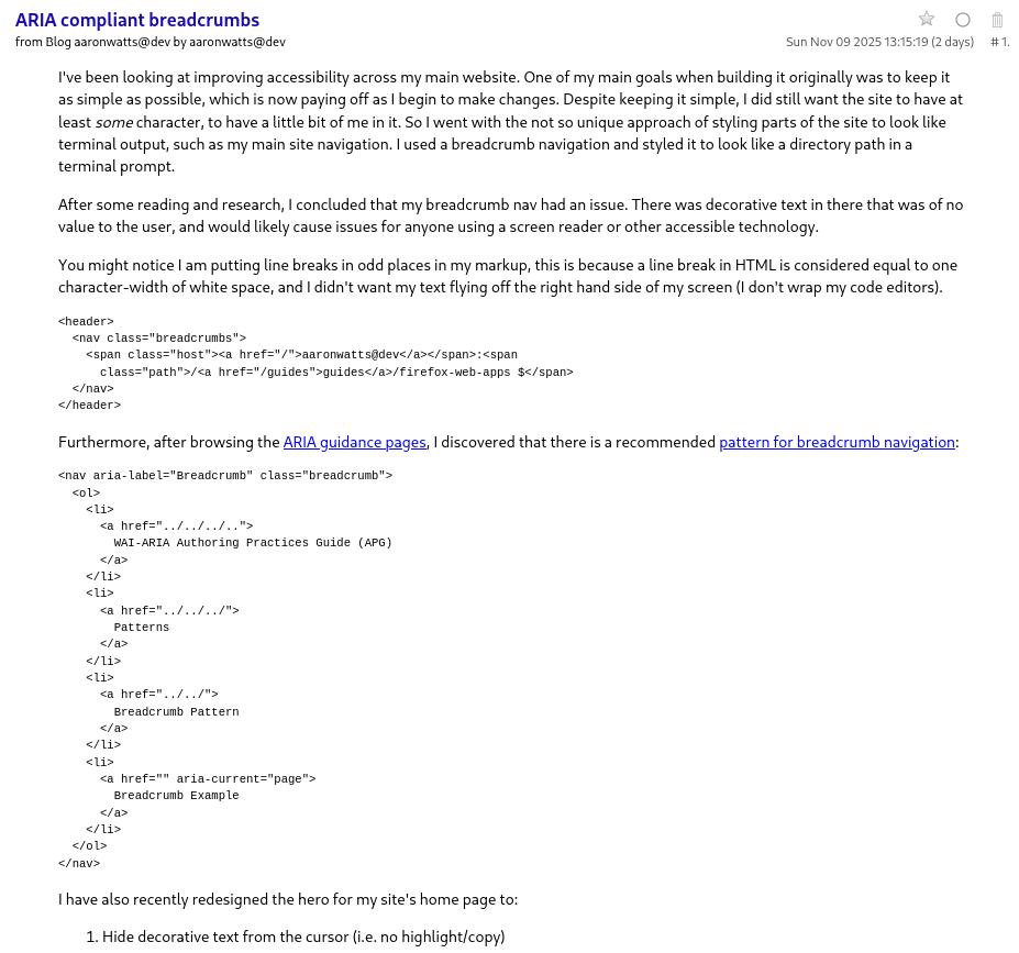 "Works in most feed readers" is not bad to be fair. With so many revisions to specifications and differing standards for syndication feeds, I think it's surprising how good the compatibility in general already is, even if it's not perfect in some places. And including full content of an article is technically a complimentary extra to RSS feeds as it is. As for Publii's choice in syndication formats, I will respect it. I will likely just put a warning to let readers know this feed might not work in some readers whenever I include code blocks that resemble XML.